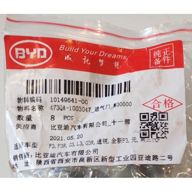 Запчастина: Клапан впускний BYD F3/F3R/F3NEW/G3 двигун 473Q. 473QA-1003047